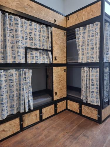Shared female dormitory room with 3 bunk beds on 3 floors.