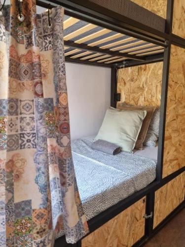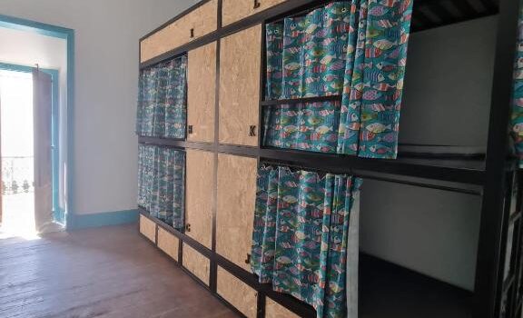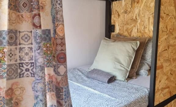 Room in a mixed dormitory with 4 bunk beds on 3 floors.